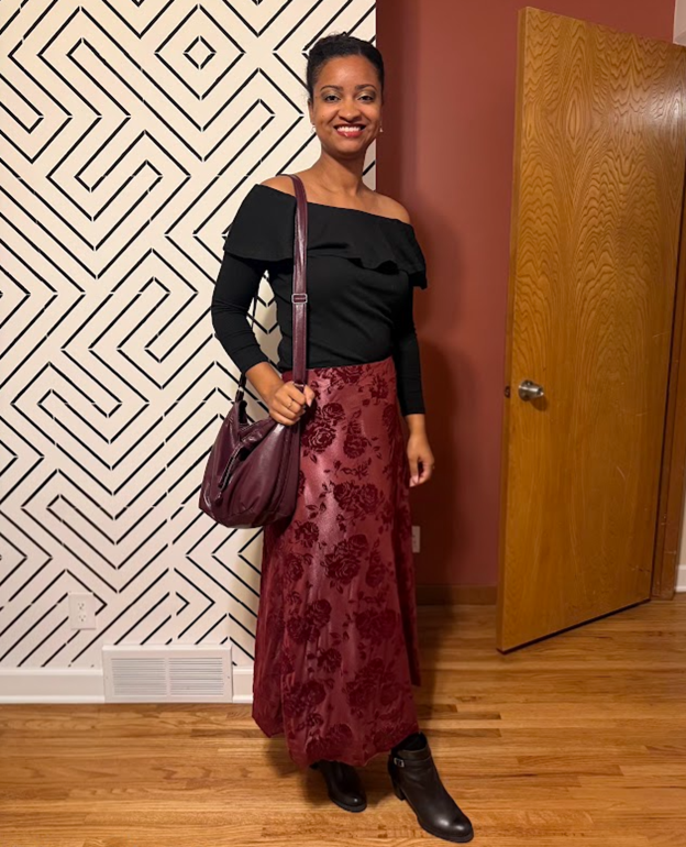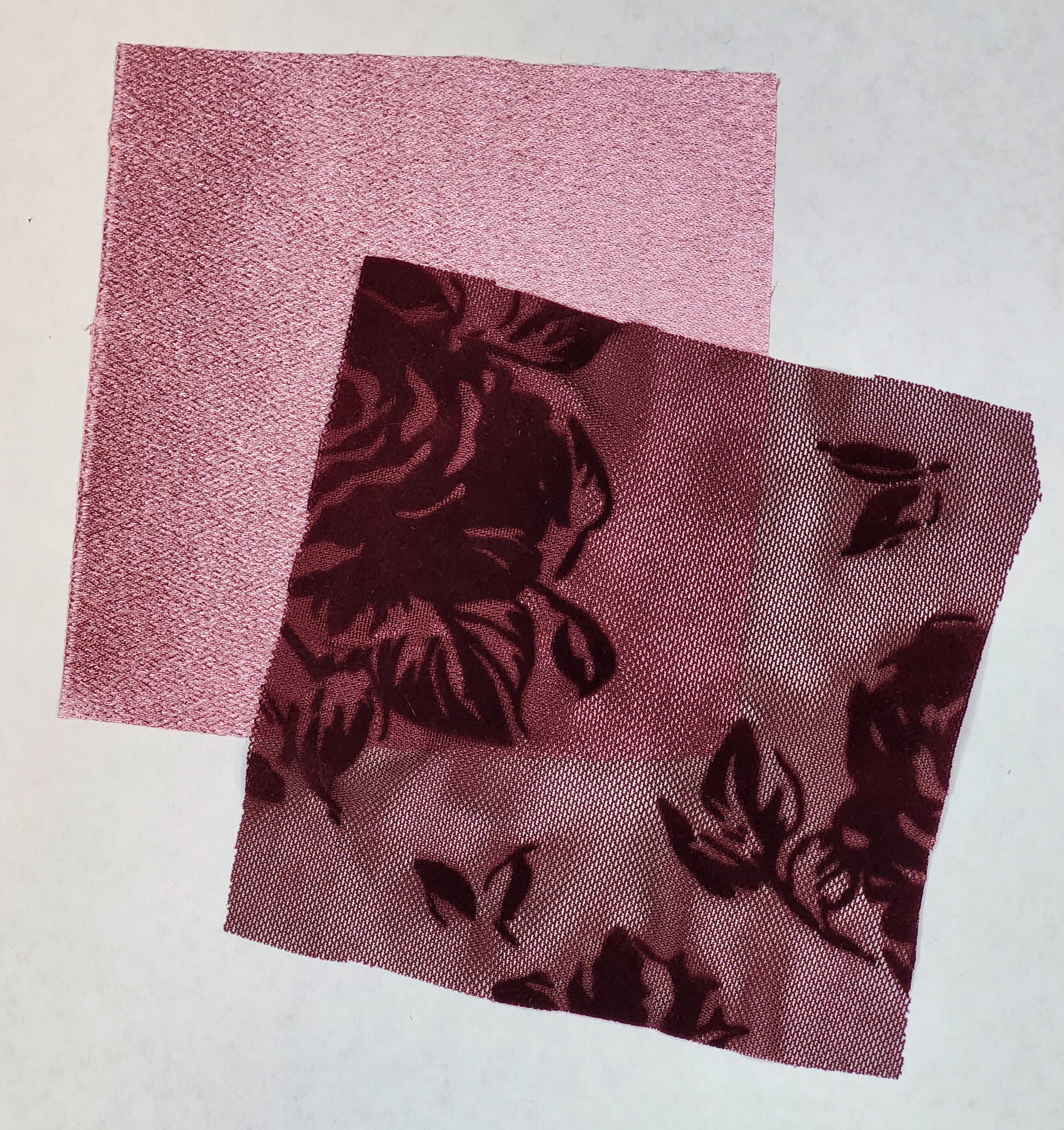 This gorgeous, floral flocked mesh stretch fabric in burgundy will be available in the Special Occasion section. After receiving the sample, I put several projects on hold to make this skirt - it's that pretty! Here, it's paired with a rose-colored satin fabric underneath (also available). I was off to my holiday party!